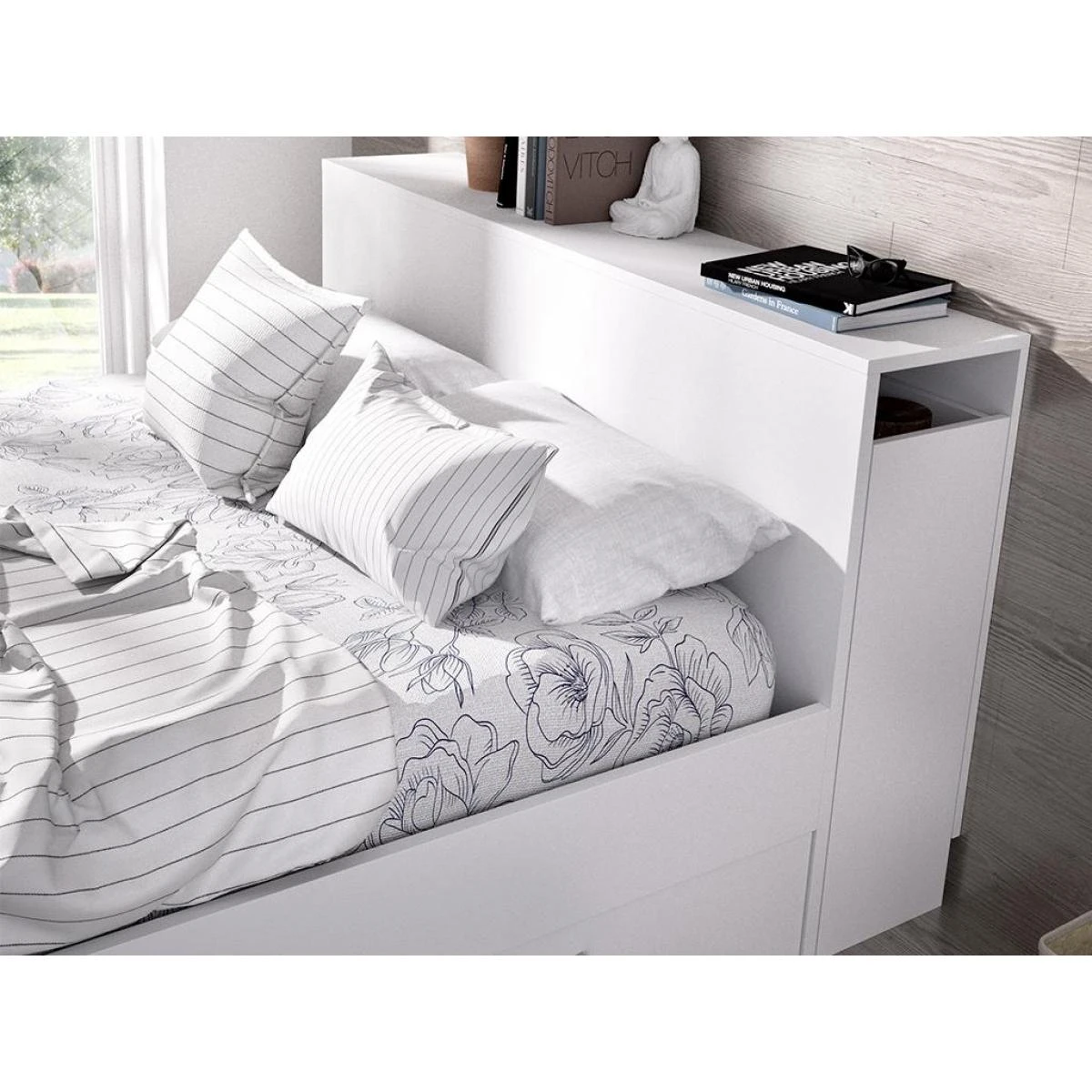 Points forts Vente-Unique Lit avec tĂȘte de lit rangements et tiroirs 140x190cm – Coloris : Blanc – FLORIAN