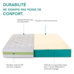 Fruit d’une recherche technologique très poussée, ce matelas ergonomique d’une place et demi 120 x 190 cm et d’une épaisseur remarquable de 23 cm représente une véritable excellence dans le secteur du sommeil. Fabriqué avec des matières durables de premier choix ainsi que 100% Made in Italy, il combine les technologies les plus avancées pour offrir un degré de confort jamais ressenti avant : la structure interne qui le caractérise est réalisée avec une couche de mousse innovante à base d’eau avec 7 zones de soutien et de massage différenciés, le tout adouci par une couche de mousse en mémoire de forme pour garantir un soutien élevé en s’adaptant parfaitement à la partie du corps qu’elle accueille, en évitant l’accumulation de points de pression gênants. La surface a un revêtement hypoallergénique doux en tissu de lin naturel BIO qui réduit considérablement la prolifération des bactéries et le périmètre du matelas est équipé d’une bande 5D respirante avec des poignées pratiques qui facilitent le déplacement.
