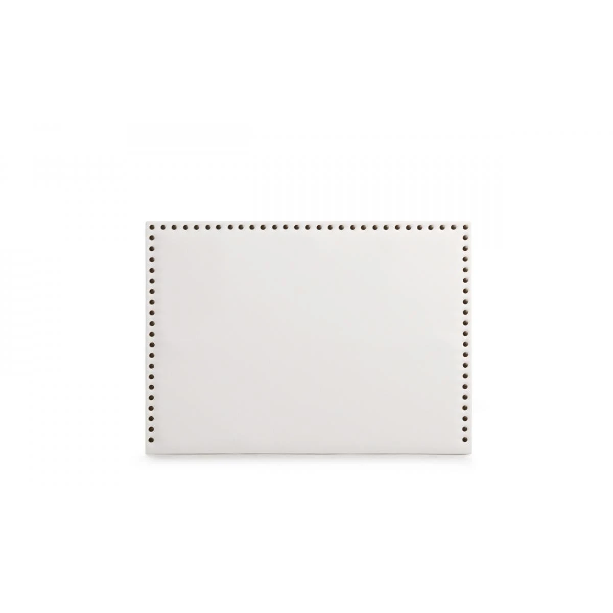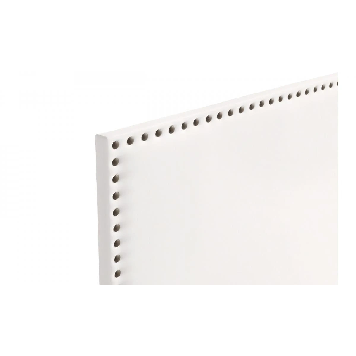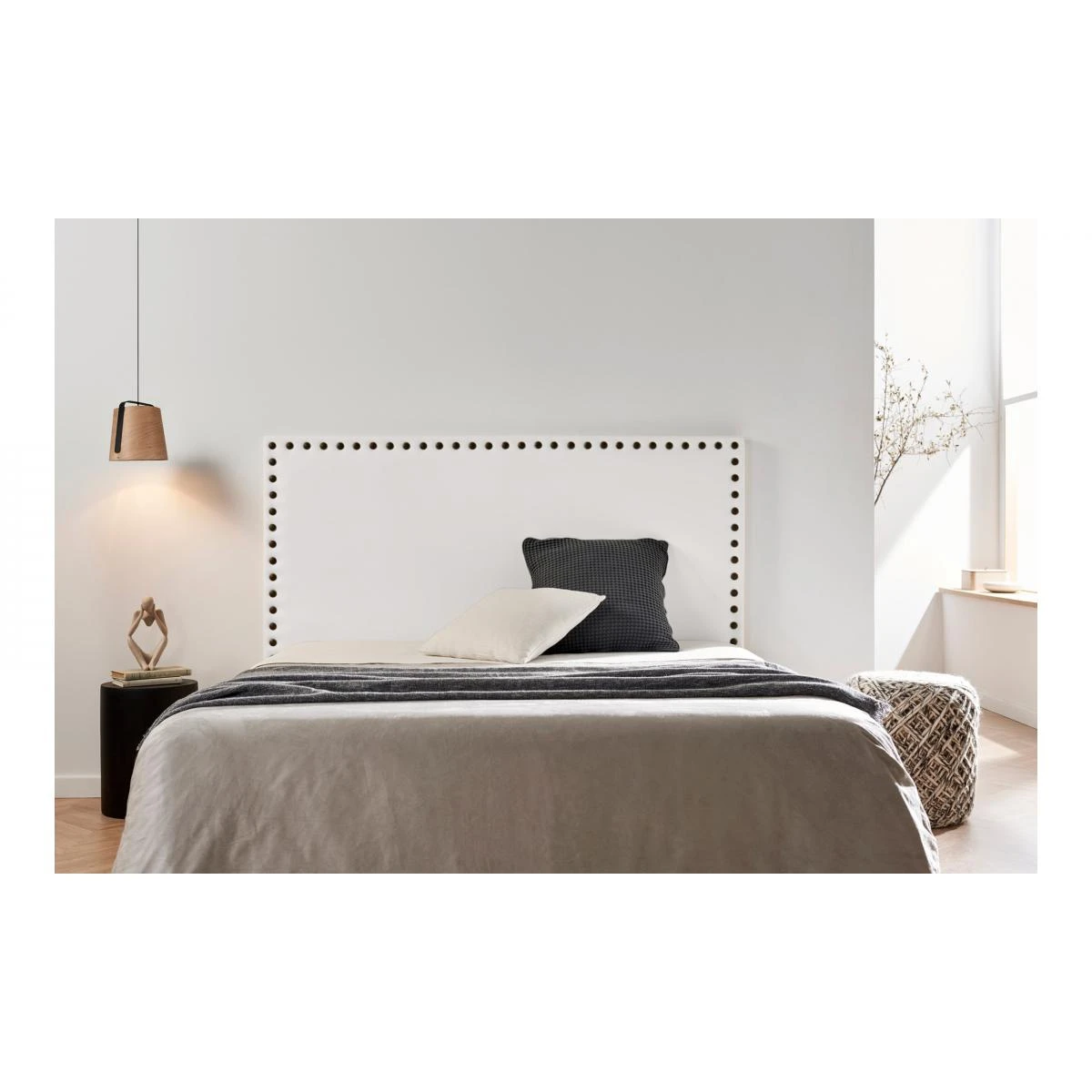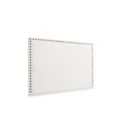 C’est une tête de lit au tissus sobre avec une touche d’élégance offerte par les clous placés sur son contour.